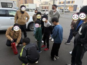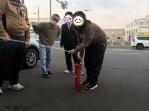 避難後に、三和防災の方に消火器のつかい方を教えてもらい、実際に体験させて頂きました✨